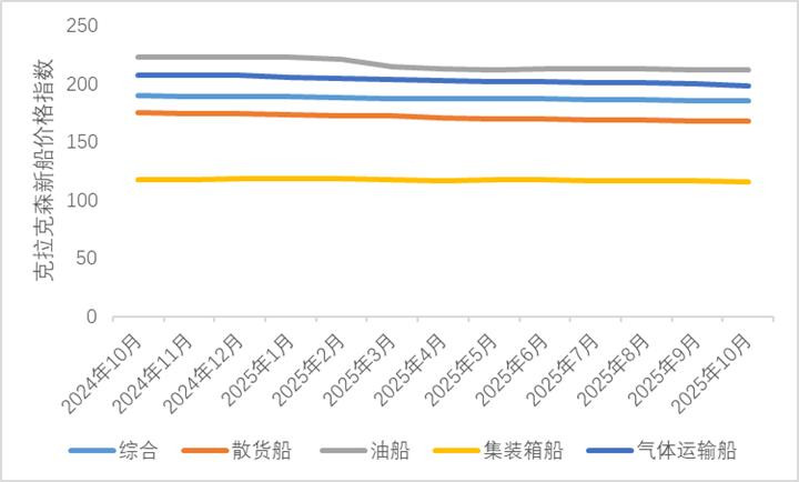 截至2025年10月,克拉克森新船价格指数收于185点,较9月继续下降,同比下降2.5%。从主力船型看,散货船、油船、集装箱船和气体运输船的克拉克森新船价格指数分别为167点、212点、116点和199点;所有船型的新船价格较9月均略有下降,降幅分别为0.1%、0.1%、0.6%和0.5%;所有船型的新船价格均出现同比下降,降幅分别为4.5%、5.1%、1.4%和4.3%。从典型船型看,VLCC的新船价格保持稳定,为1.26亿美元;2.3万TEU集装箱船和17.4万立方米LNG运输船的新船价格有所下降,分别为2.665亿美元和2.48亿美元。