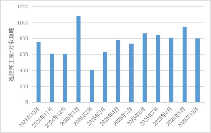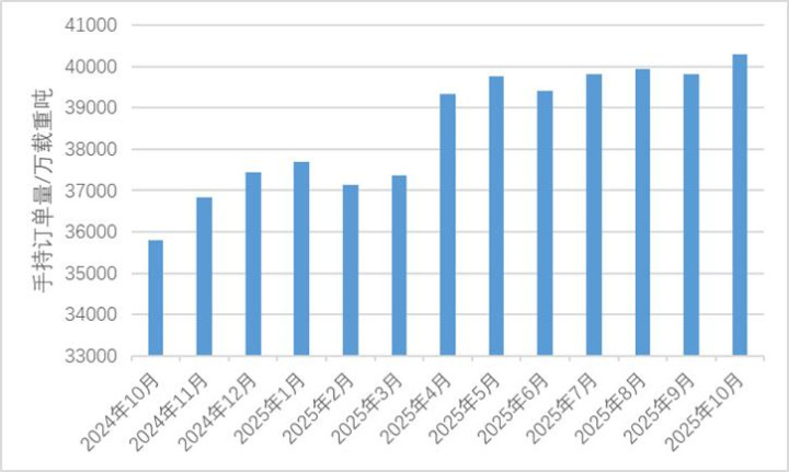 10月,全球成交新船订单136艘1048万载重吨,同比分别上涨60.0%和81.3%,环比分别下降11.7%和上涨14.5%。全球船舶完工交付140艘800万载重吨,同比分别上涨0.7%和5.8%。10月末,全球船舶手持订单6274艘4.03亿载重吨,同比分别上涨9.9%和12.5%。